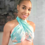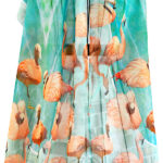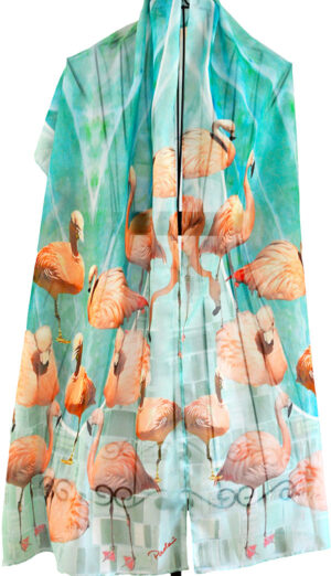 A parade of pale orange flamingos, soft aqua and cream striped background. Original design, handmade, lightweight, printed chiffon scarf for women. Unique gift, generous size for versatile styling.