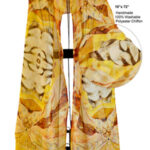 Rich golden browns and tan. Original design, handmade, printed chiffon scarf. Unique gift, generous 18″ x 72″ size for versatile styling.
