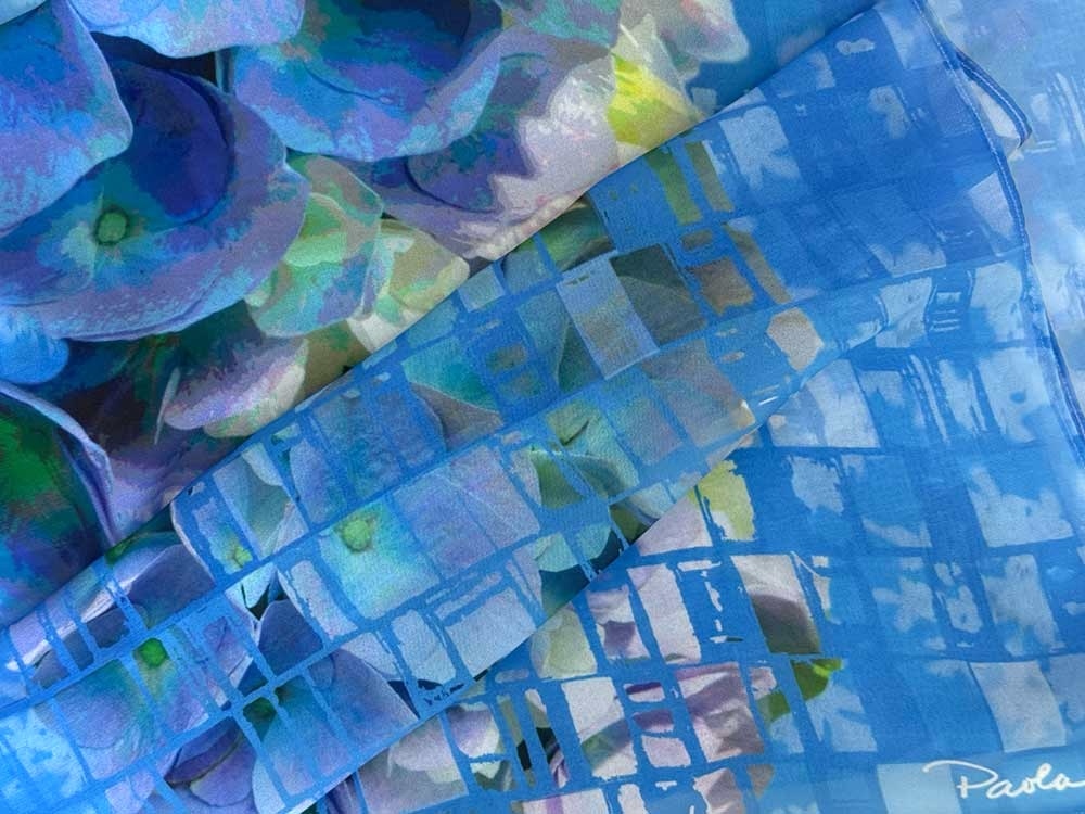 Gorgeous blue hydrangeas on blue vegan silk. Digital print, hand finished in America by the artist. Soft drape, travel friendly. Generous 18” x 72” for versatile styling.