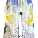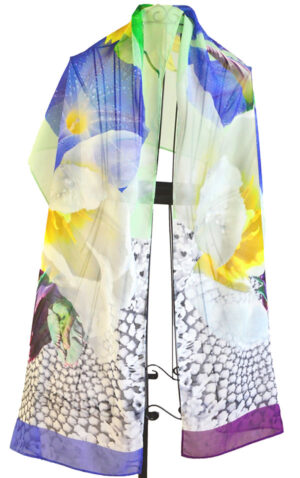 Digital print on vegan silk, hand finished in America by the artist. Soft drape, travel friendly. Generous 18” x 72” for versatile styling.