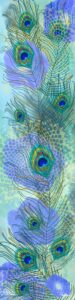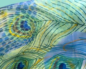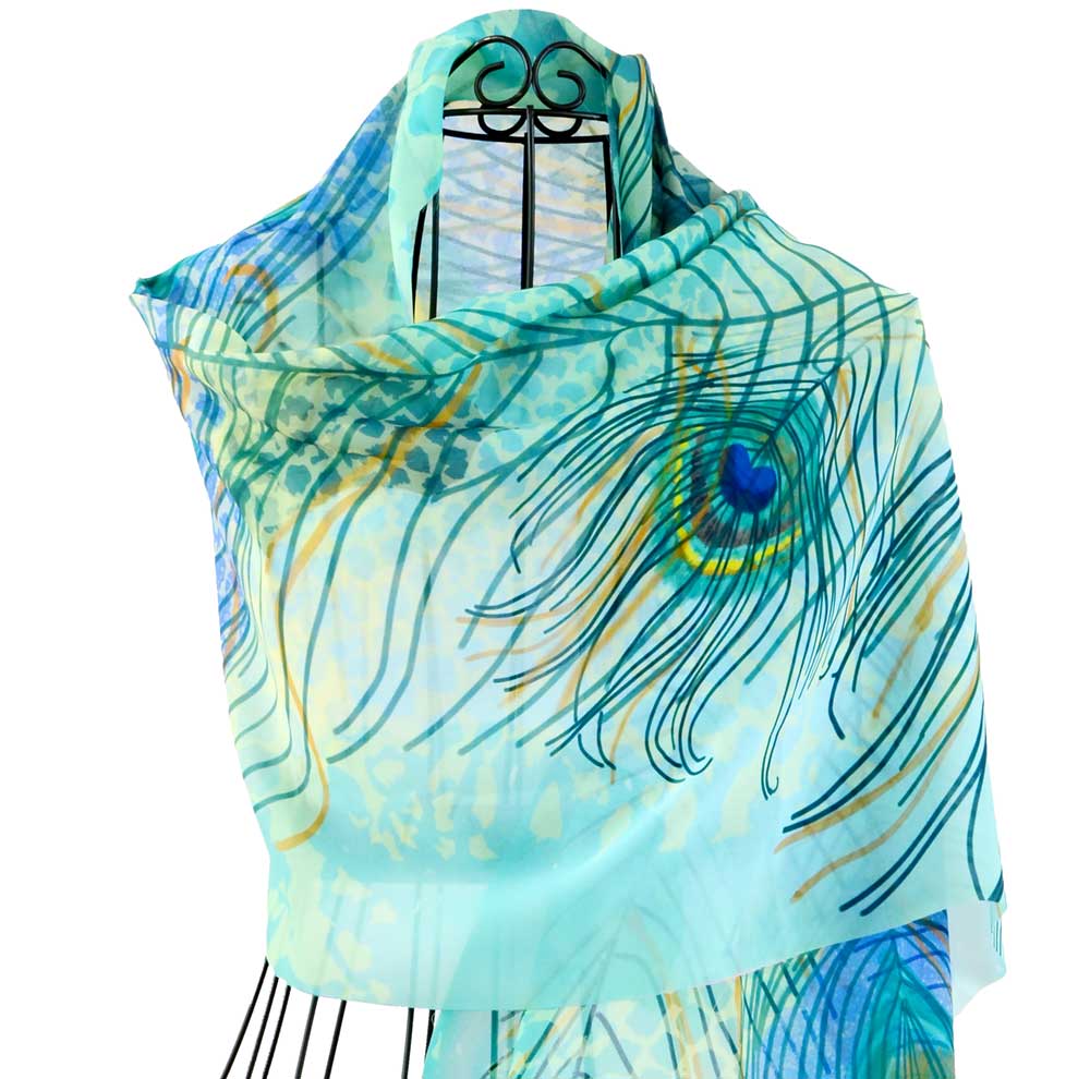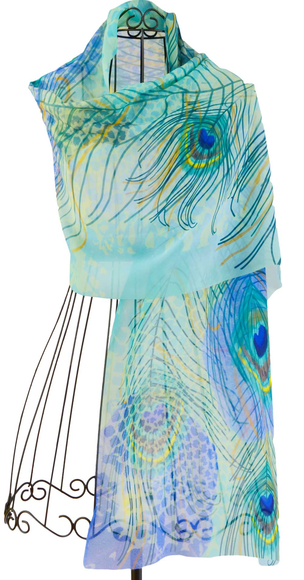 Original design, limited edition, hand drawn peacock feathers, bright yellow accents, purple morning glories on aqua. Digital print on vegan silk, hand finished in America by the artist. Soft drape, travel friendly. Generous 18” x 72” for versatile styling. Easy care, hand wash, line dry.