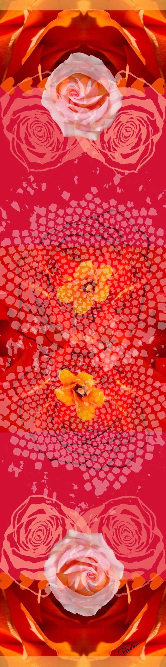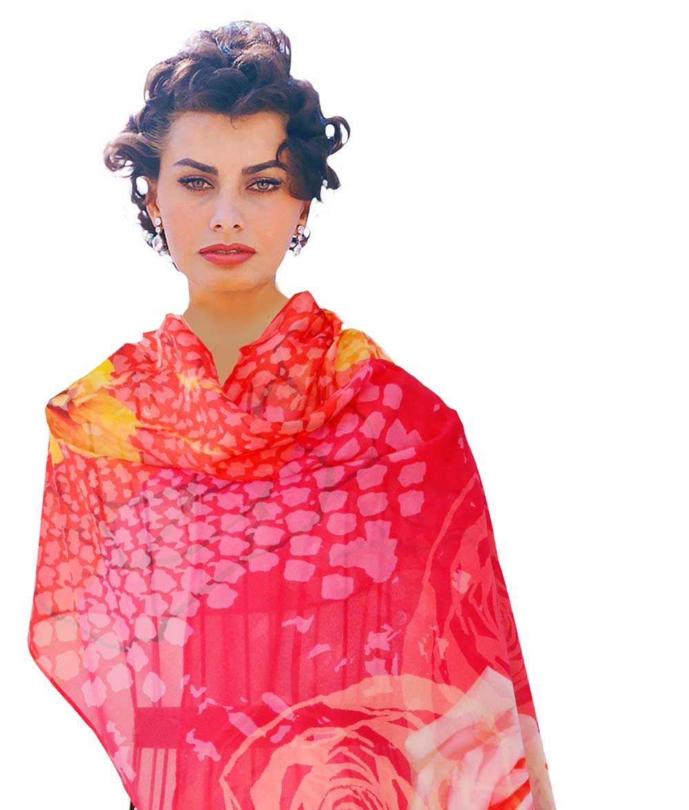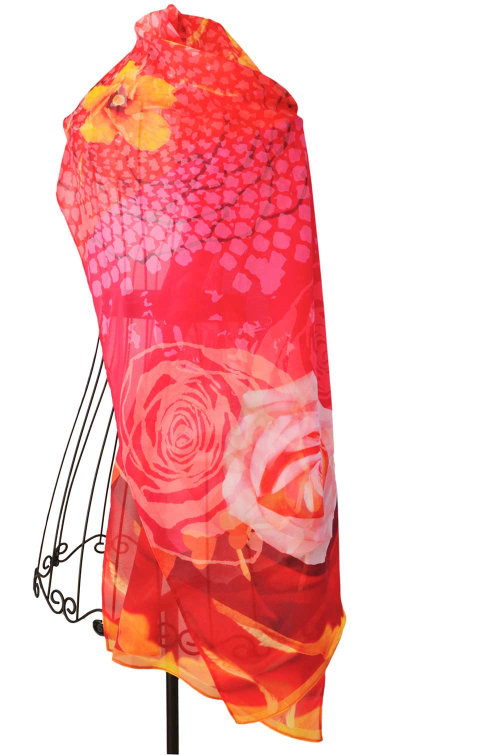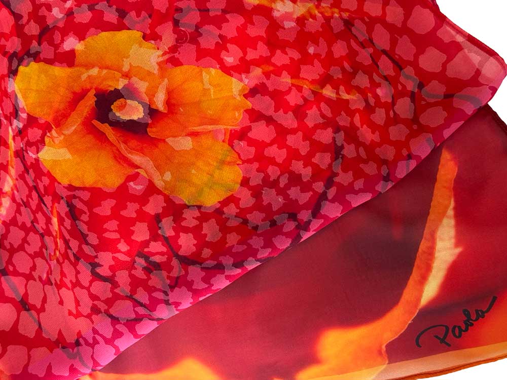 Elegant rose red and orange hibiscus- enduring elegance on vegan silk. Digital print, hand finished in America by the artist. Soft drape, travel friendly. Generous 18” x 72” for versatile styling.