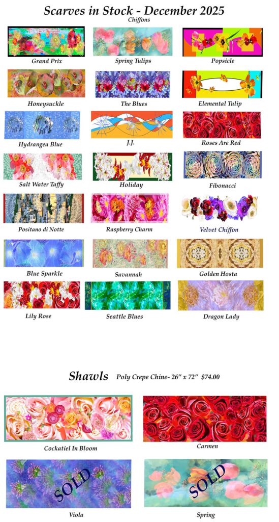 All my scarves are designed and hand sewn by me. Each design is permanently printed to 100% washable poly chiffon, and hand washable. I’ve added a new fabric -crepe de chine. You can order any in-stock scarf below in either fabric and I can ship to you. I only stock chiffons. Each design can also be produced as a shawl on heavier crepe de chine at 26” x 72” – priced at $74.00.