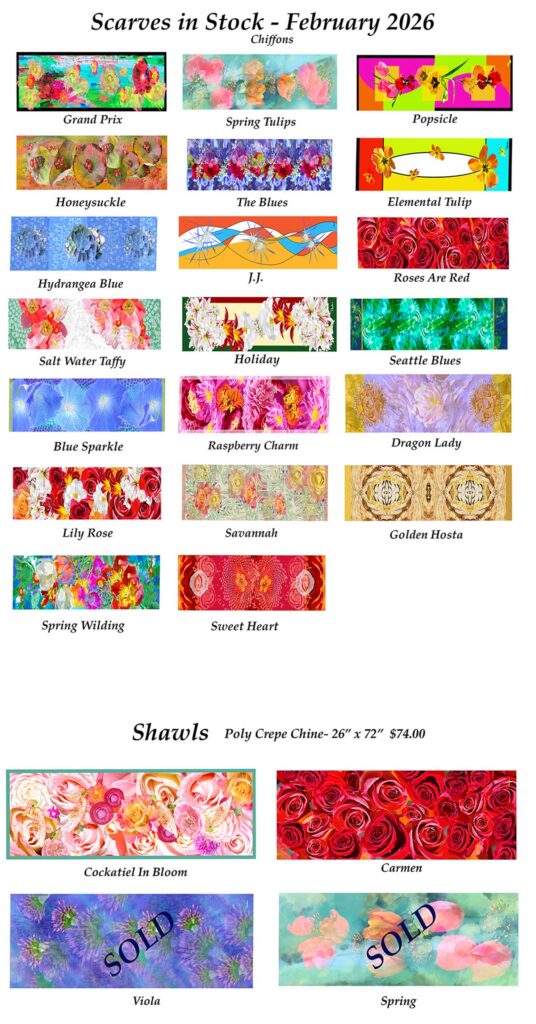 All my scarves are designed and hand sewn by me. Each design is permanently printed to 100% washable poly chiffon, and hand washable. I’ve added a new fabric -crepe de chine. You can order any in-stock scarf below in either fabric and I can ship to you. I only stock chiffons. Each design can also be produced as a shawl on heavier crepe de chine at 26” x 72” – priced at $74.00.